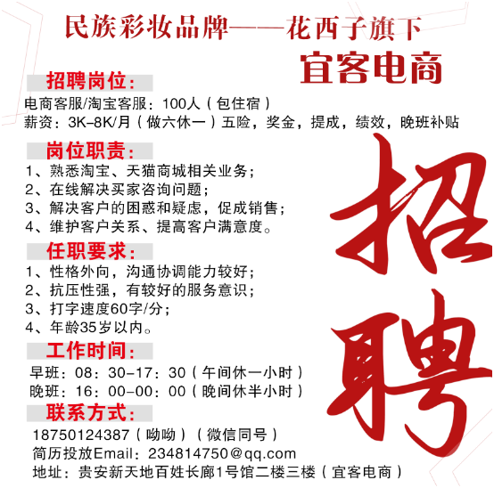 招聘人数:100 人 工资:3000-8000 元/月(做六休一)